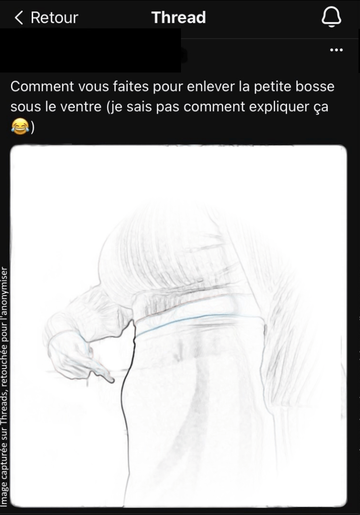 Il y a quelques temps, je suis tombé sur une discussion sur Threads. La question était posée par une femme, qui se demandait « comment faire disparaître ça », montrant un petit bourrelet sur son ventre. J’ai essayé d’anonymiser aussi bien l’image, merci à toute personne (bien improbable) qui aurait vu passer la discussion de rester discrète :