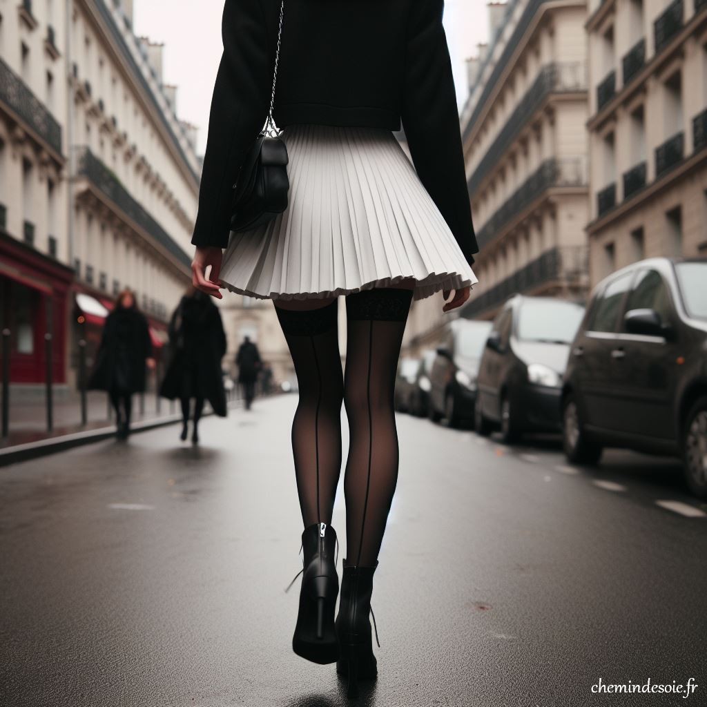 Toi, qui arrivais de l’ouest, comme moi, et qui avais visiblement besoin de traverser cette rue, aussi. Toi qui étais poussée, peut-être, par une sorte d’urgence : tu t’es lancée à l’assaut du pavé à l’instant où le feu t’en a donné l’opportunité. C’est là que je t’ai vue et que j’ai décidé sans vraiment m’en rendre compte que, moi aussi, j’avais besoin de traverser la rue à cet endroit. Je me souviens d’un mélange de noir et de blanc. Noire, ton blouson. Noires, tes jambes, vêtues de nylon. Encore plus noir ce qui, sur le haut, faisait franchement penser à des revers. Et blanche, ta jupe plissée, un peu courte peut-être mais j’ai su prendre sur moi pour ne pas m’en offusquer. Blanc aussi, le ruban qui te tenait les cheveux, pardonne-moi, je n’ai pas regardé en détail comment tu étais habillée, comment tu étais coiffée. Blanche aussi, enfin, cette peau que laissait entrevoir un trou sur ton revers, à l’arrière de ton bas gauche. Pas un keyhole, malheureusement, mais il faut parfois savoir se contenter de ce qu’on a, surtout quand on en a déjà tant !