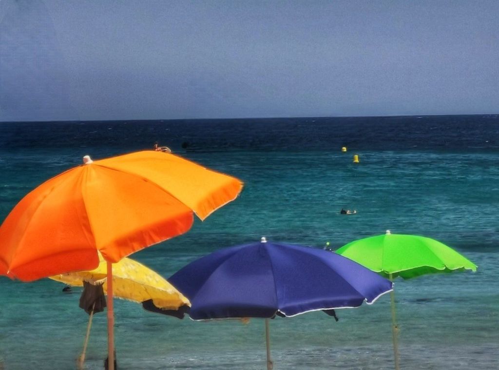 J’avais mentionné le manque de couleurs des parapluies. Les parasols, dont la fonction est finalement assez proche, ne souffrent pas de ce problème : une plage ensoleillée permet d’assister à une vraie fantaisie de couleurs. Si on veut bien me permette un petit aparté : c’est peut-être la raison pour laquelle les parapluies chinois sont si colorés, devant assurer un double rôle de protection contre la pluie et contre le soleil, à tel point que j’en ai vu là-bas qui venaient avec leur indice de protection solaire. Ce qui m’amène à une autre remarque : si les ombrelles sont toujours banales en Asie, elles ont complètement disparu de nos cieux alors qu’elles y régnaient encore au début du siècle dernier. La première guerre mondiale a vraiment vu la fin d’un monde ! À moins que ce ne fût les congés payés ?