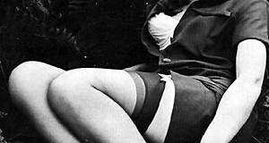 Photo noir et blanc d'une femme des années 50 montrant ses bas et ses jarretelles
