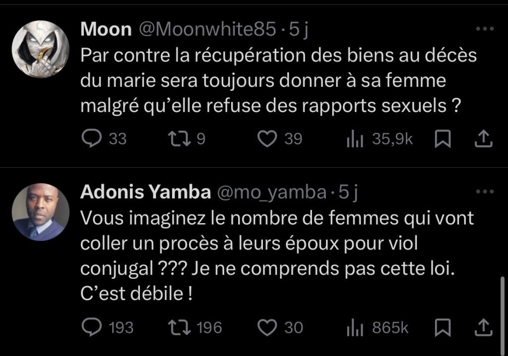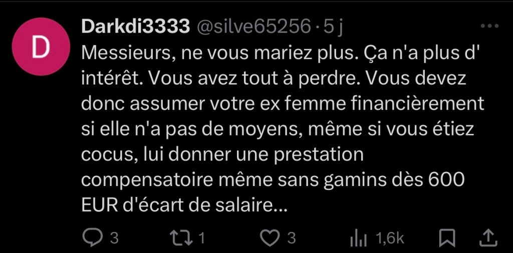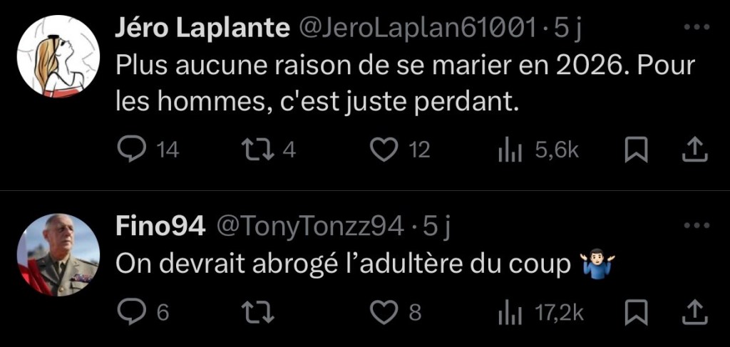 Notez, au passage, que certaines de ces réactions ne sont même pas le fait d’hommes français, j’en ai vu notamment un qui semblait, d’après son profil, vivre en Côte d’Ivoire. Quel peut être l’effet d’une loi française à Yamoussoukro ? Je n’en ai aucune idée. Il en ressort tout de même une constante : visiblement, pour tous ces hommes, à supposer qu’ils ne trolleraient pas, la suppression du devoir conjugal entraîne la suppression de tout intérêt au mariage. Et là, je ne sais pas vous, mais moi, je me demande… quelle est la proportion de personnes qui se marient en se disant que l’acte leur donnerait un accès open-bar à la bagatelle ? Je n’ai pas de chiffres, mais j’ose espérer qu’elle est ultra-minimale. Donc quand je vois ces réactions, validées par des influenceurs masculinistes, je me demande sérieusement à quel point ils peuvent être représentatifs de la population masculine française.